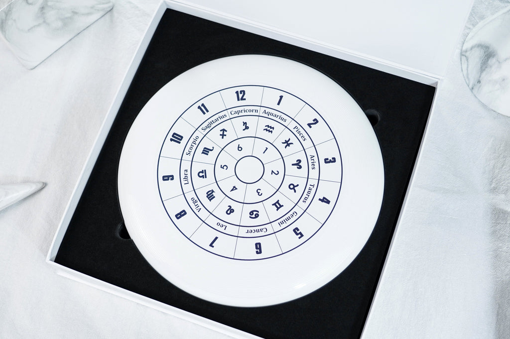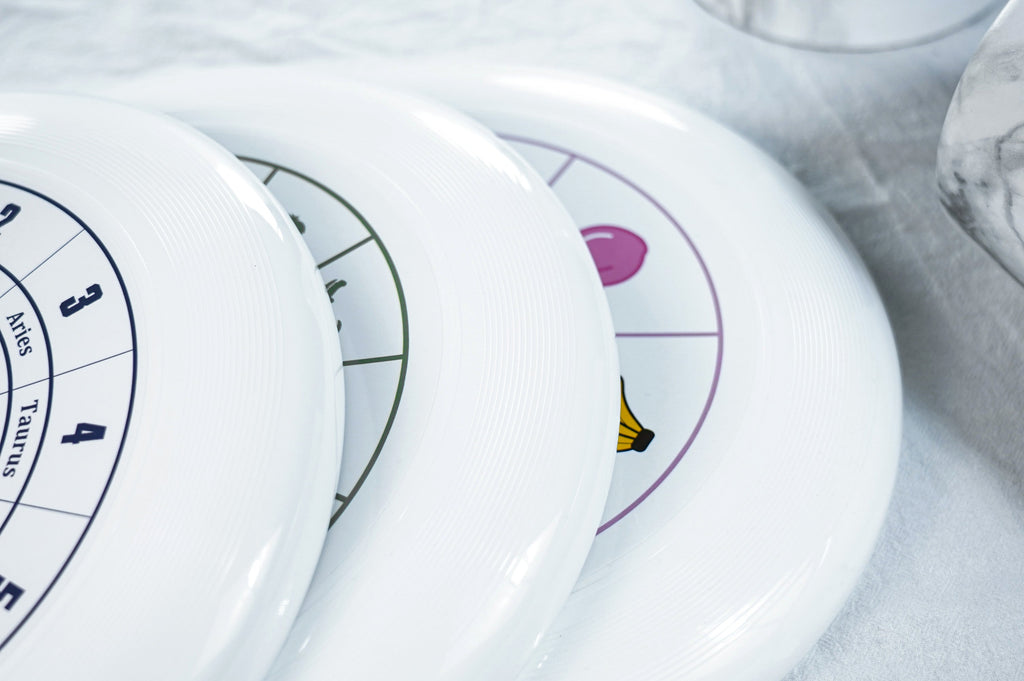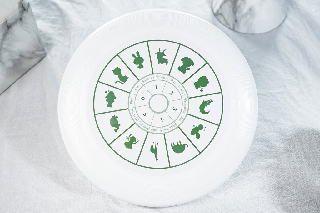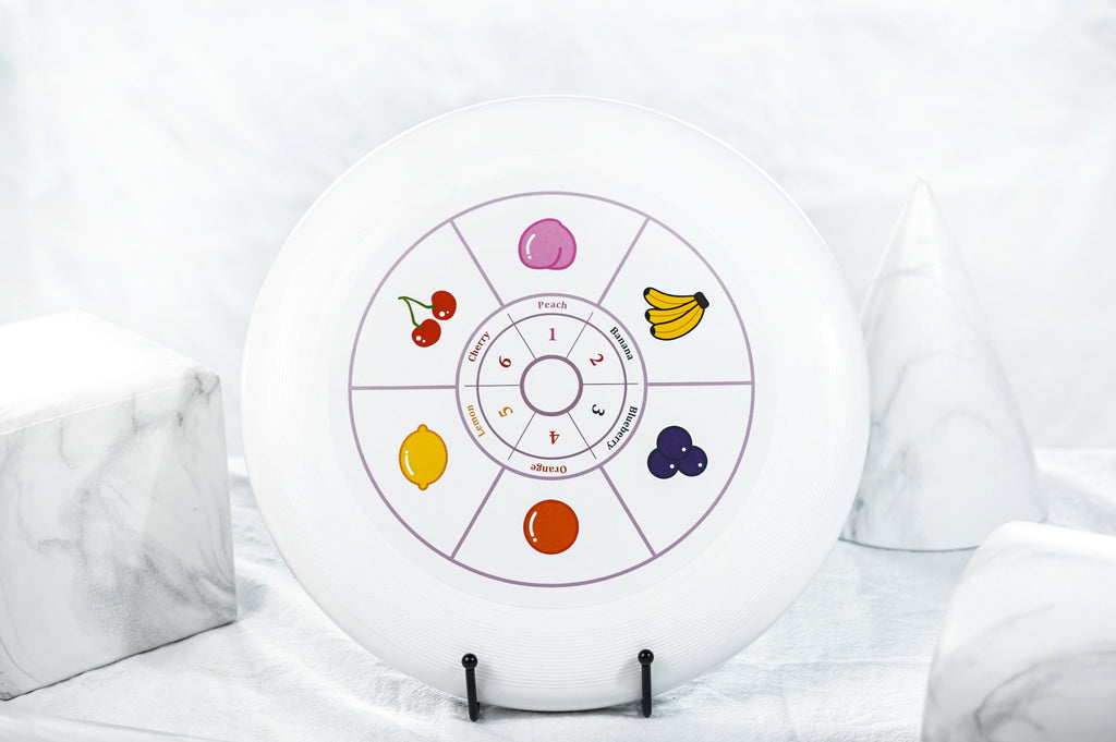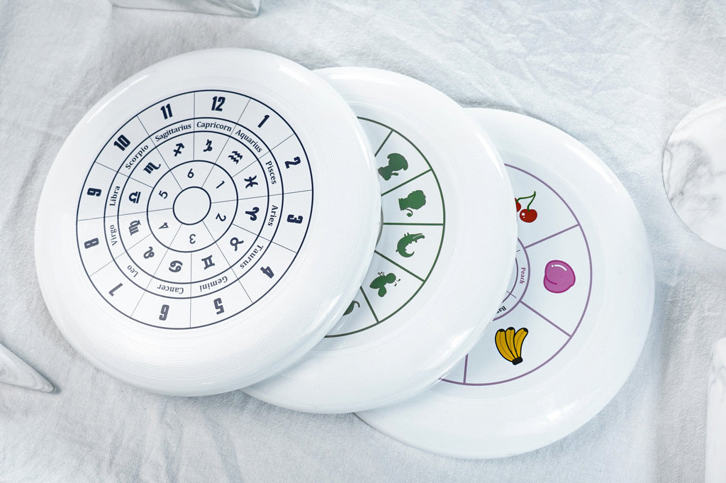 The sticker on the surface of the frisbee can be replaced with any symbol selection of choices you want. Numbers, ESP symbols, zodiac signs, animals, locations, fruits, characters, brands...even the product line of your corporate clients.