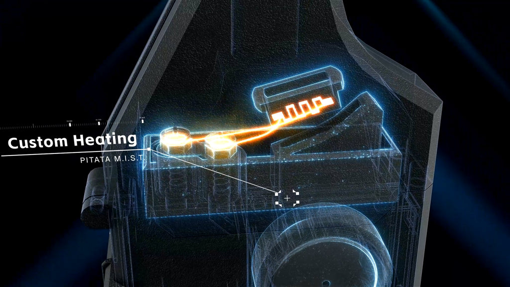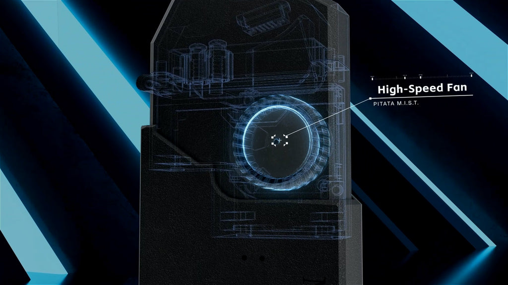 PITATA M.I.S.T. produces 70% more smoke than similar-sized smoke devices, and it releases it in an aesthetically pleasing and visually striking, fluid-like mist. To achieve this, we designed a custom heating system that generates a large volume of smoke in a short time. The smoke is then expelled through an optimized air duct by a high-speed fan, ensuring smooth and continuous output.
